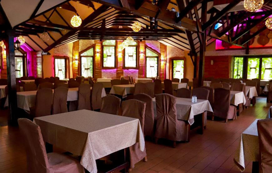 В ресторані на Вас очікує стильний, виконаний в дерев’яних тонах зал, з танцполом та невеликою барною стійкою. Через вихід з ресторану можна потрапити на літній майданчик з фонтанами, невеликою альтанкою, мощеною кам’яною огорожею та імітацією гірського потічка.