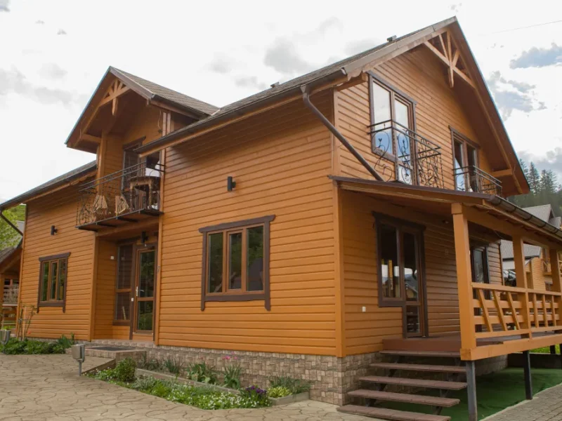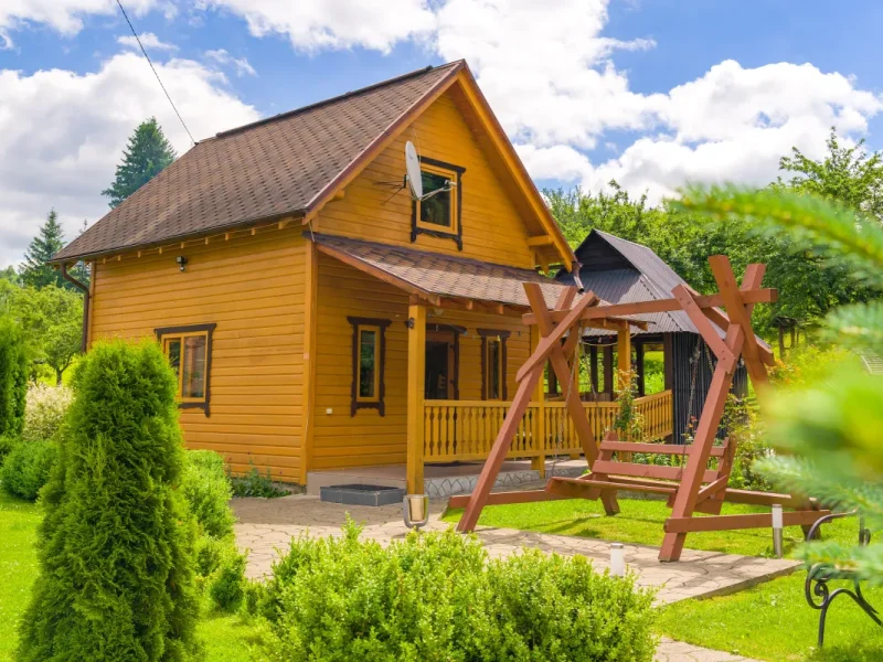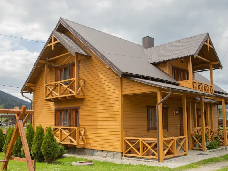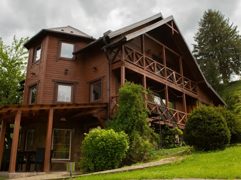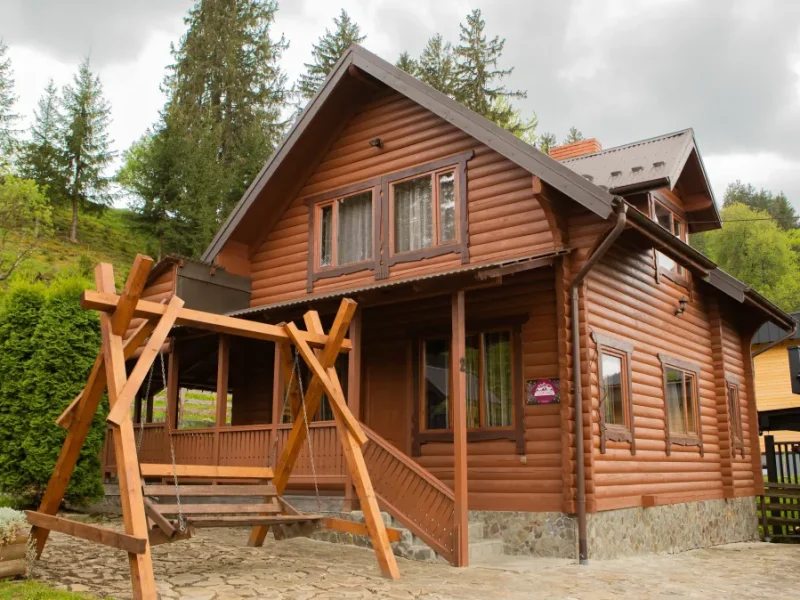Die Gäste können in 5 Häusern wohnen – vier zweistöckigen und einem dreistöckigen. Alle Hütten sind im huzulischen Stil aus Naturholz gebaut, mit geräumigen Zimmern und unglaublichen Panoramen aus den Fenstern und Balkonen.