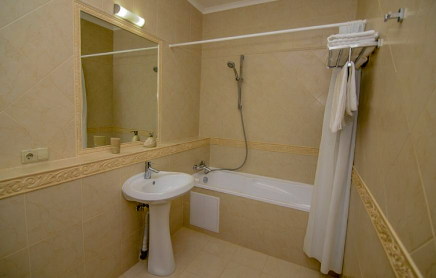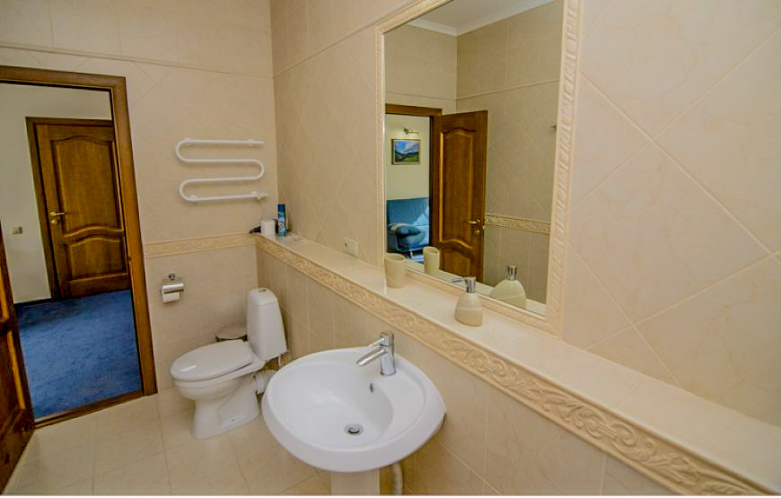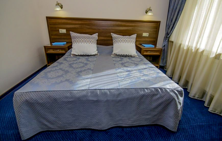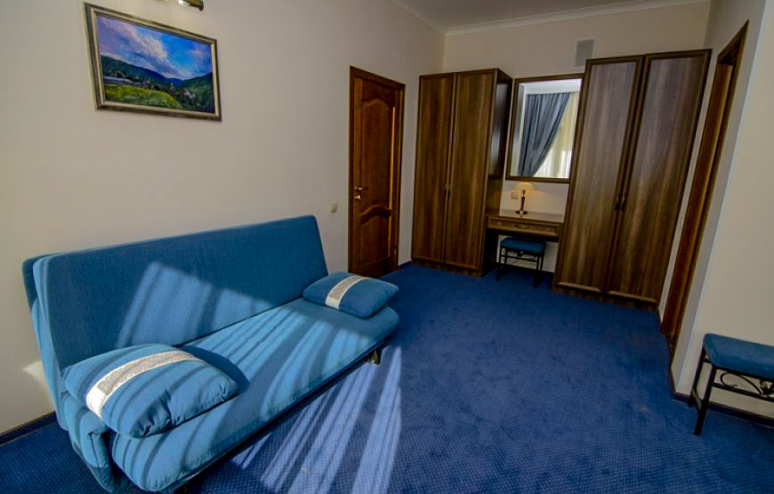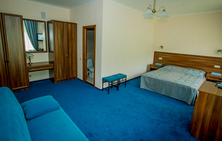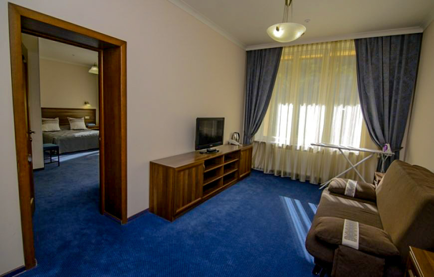 Das Zweizimmer “Kvasy Deluxe” befindet sich im fünften Stock des Wohnheimgebäudes des Sanatoriums. Dies ist ein helles und geräumiges Zimmer mit einem großen Doppelbett und einem Sofa in einem Zimmer und einem weiteren Schlafsofa im anderen.