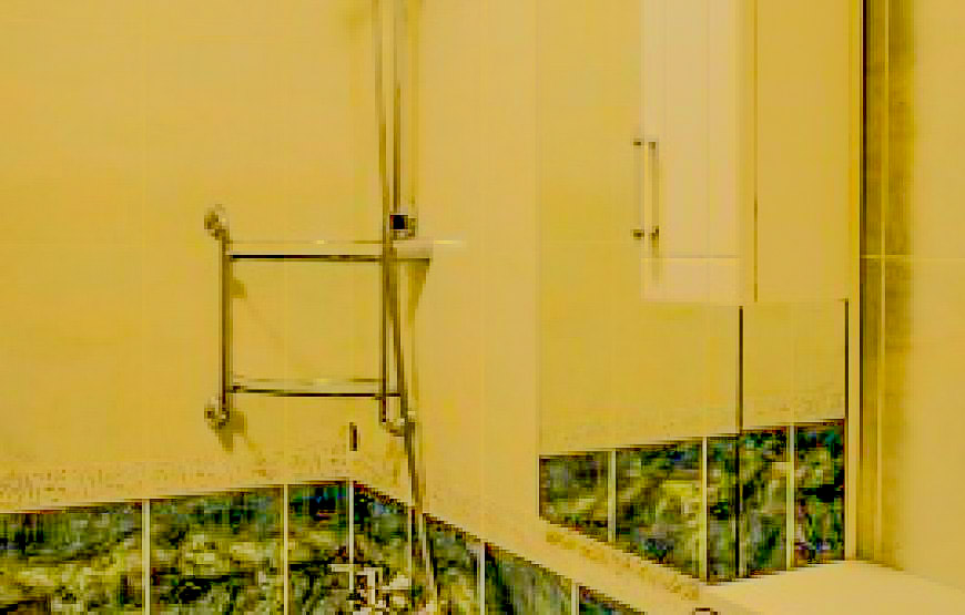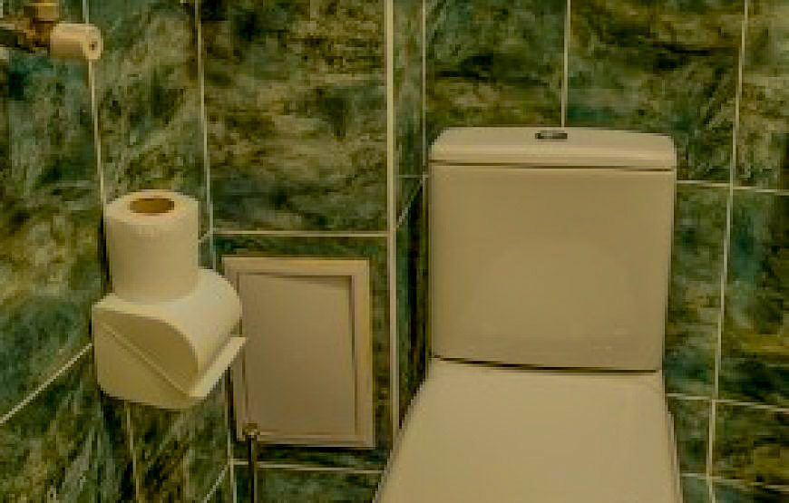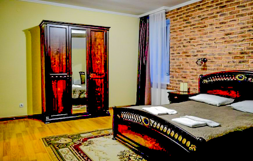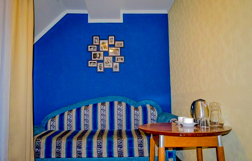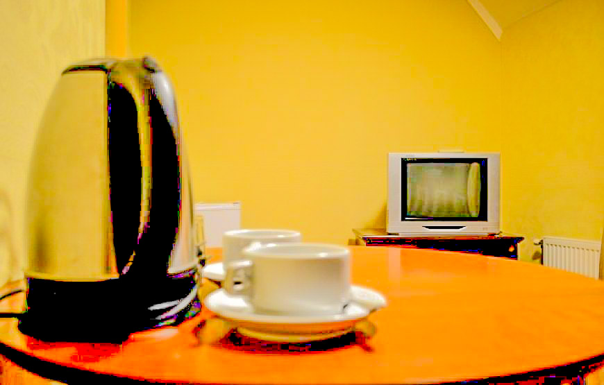Das Zimmer hat eine Eingangshalle, ein Badezimmer von 4,5 Quadratmetern. m. mit Haartrockner, ein Doppelbett im Schlafzimmer, 2 Fernseher, ein Kühlschrank, ein Wasserkocher, Teetassen, ein Tisch mit zwei Stühlen, eine Karaffe und zwei Gläser, ein großes Klappsofa im Wohnzimmer.