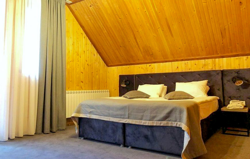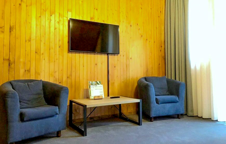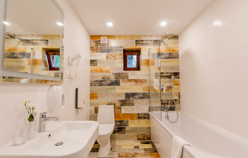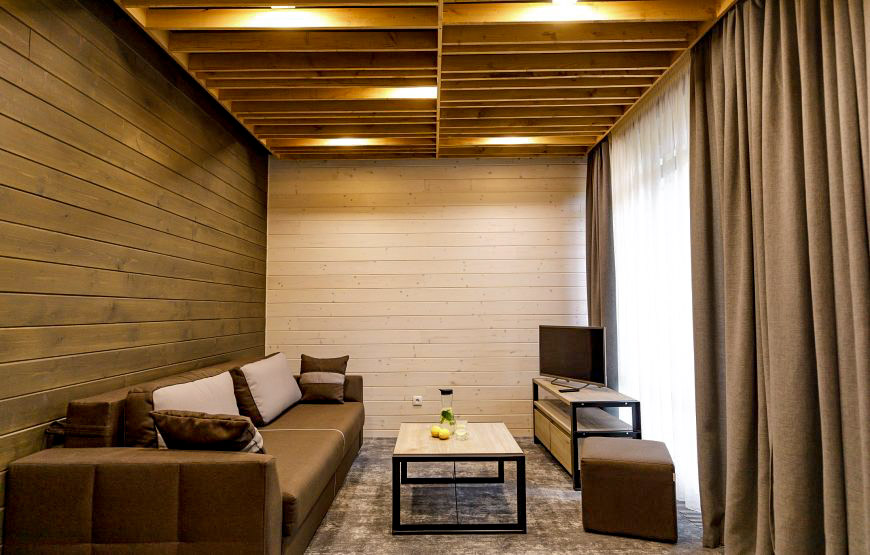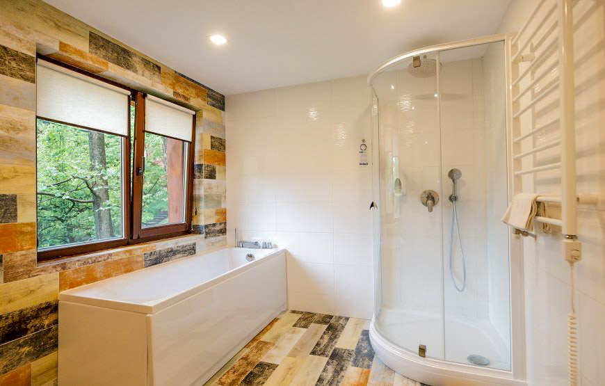 Eine großzügige Zweiraum-Suite der Kategorie „Suite“ mit gemütlichem Gästezimmer. Das Badezimmer verfügt über eine Badewanne und eine Dusche.
