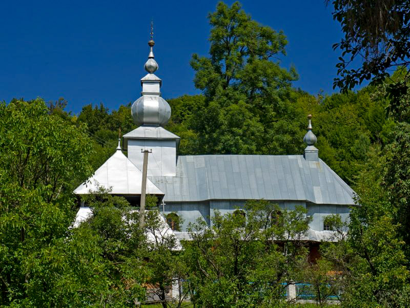 Die Kirche ist dreibogig mit einem niedrigen quadratischen Turm über dem Kirchenschiff, auf dessen Kuppel eine Zinne steht, auf der ein winziger quadratischer Türmchen steht, der in einer kleinen Zinne mit einem Kreuz endet. Das Blockhaus des Langhauses ist etwas breiter als die Babinets und der Altarteil. Das Kirchenschiff hat einen rechteckigen Grundriss, und der Altarteil hat eine fünfeckige Form.
