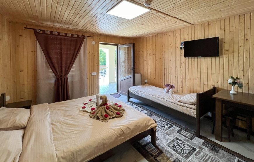 The hotel offers a two-storey wooden building with 19 suites. Each of the rooms has a bathroom (shower, washbasin, toilet), comfortable furniture, TV, refrigerator.