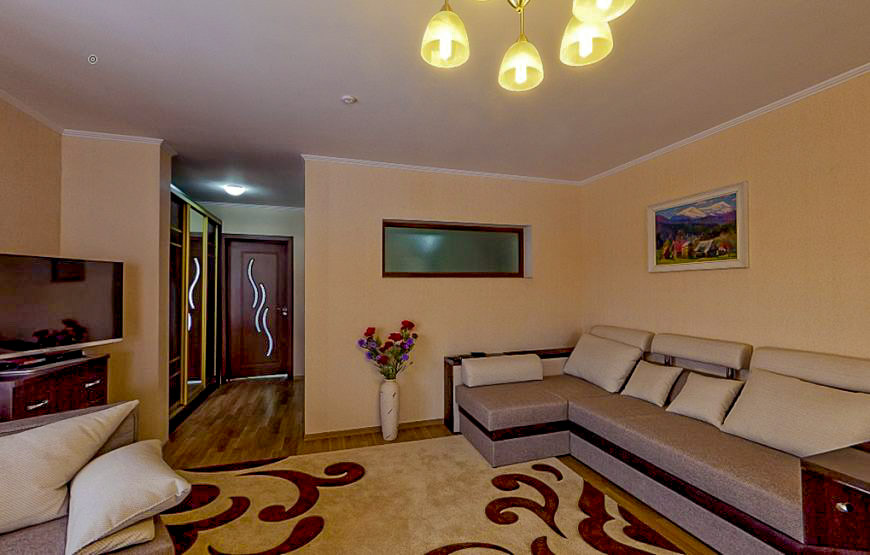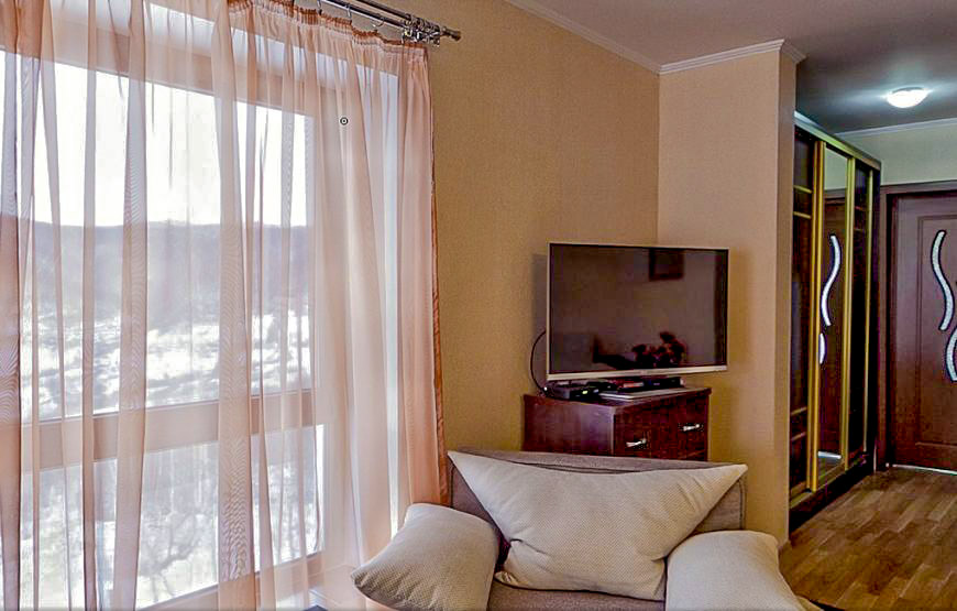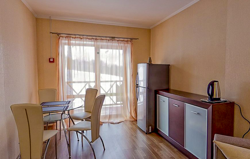 - Living room with large panoramic windows and access to the terrace (compartment wardrobe, fold-out soft corner, 2 soft armchairs, coffee table, chest of drawers, plasma TV, sideboard with dishes, electric kettle, refrigerator, glass dining table, 4 chair).