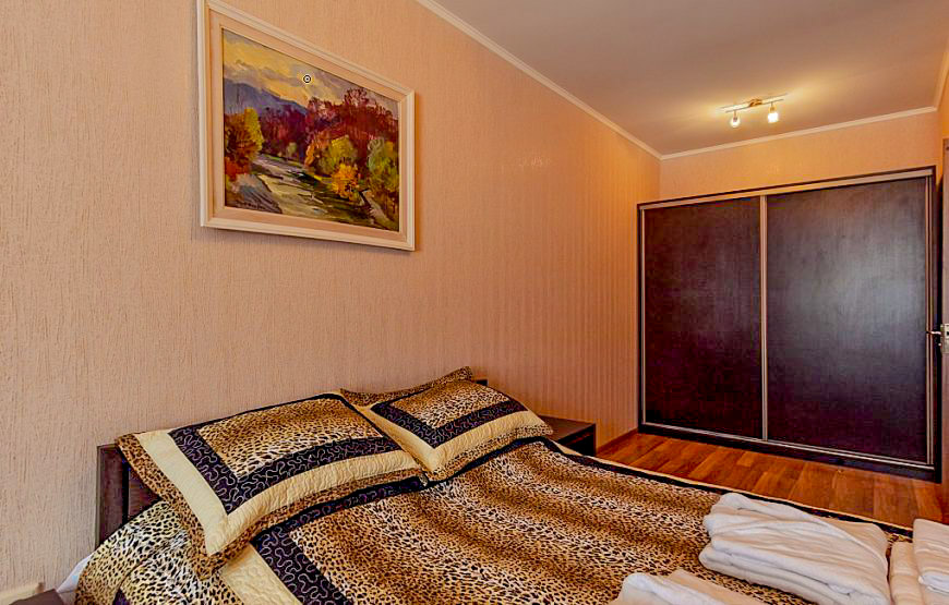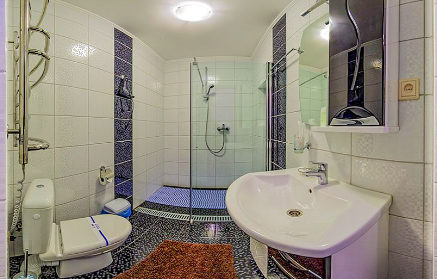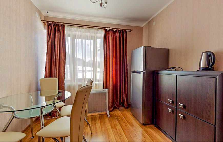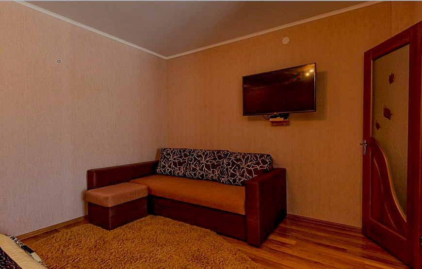 - room with access to the street (double bed, bedside tables, wardrobe, chest of drawers, plasma TV, fold-out soft corner, dining glass table, 4 chairs, electric kettle, refrigerator)