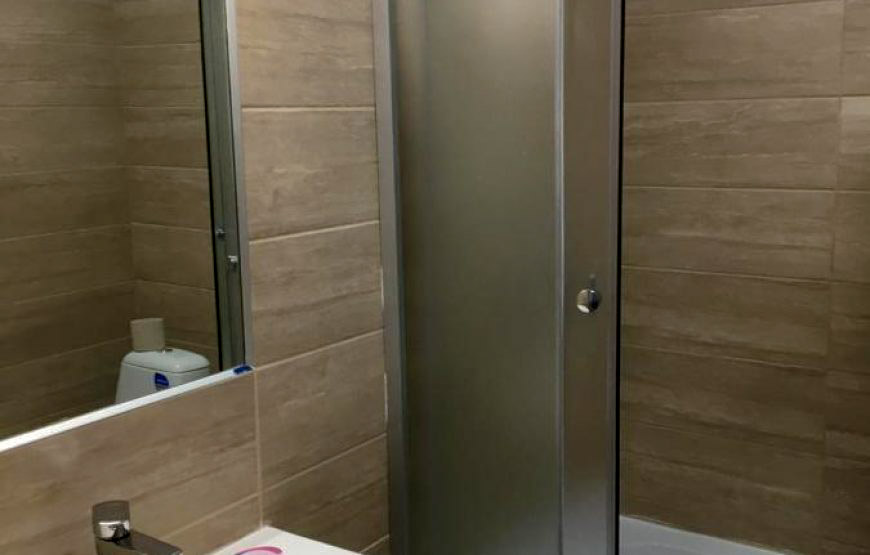 Bathrooms in these rooms consist of a shower cabin, a toilet, a sink, a mirror, and a dryer.