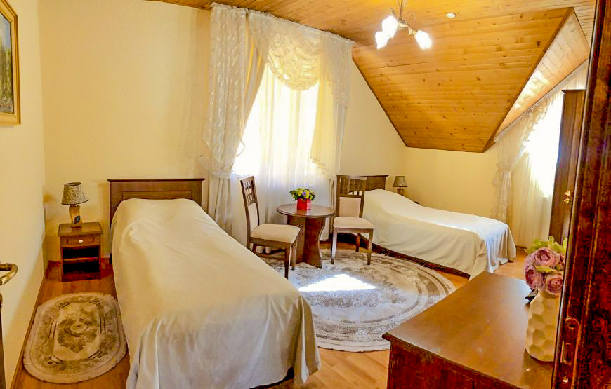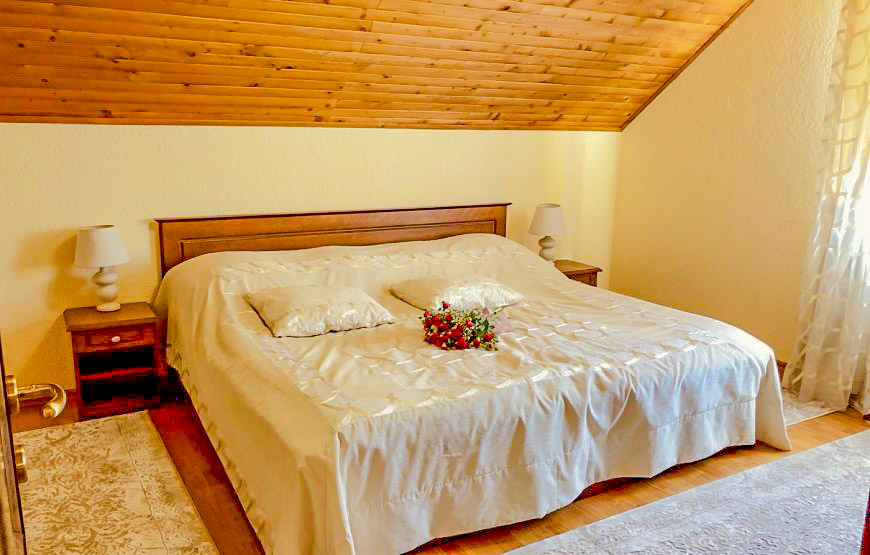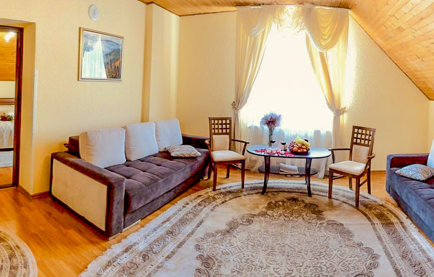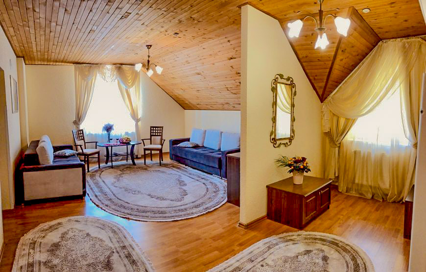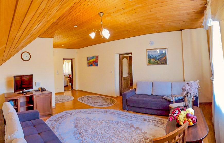 A spacious three-room suite on the second floor of a wooden cottage, with an area of 75 m². It has two bedrooms, two bathrooms and a comfortable living room. Perfect for relaxing with friends and family.