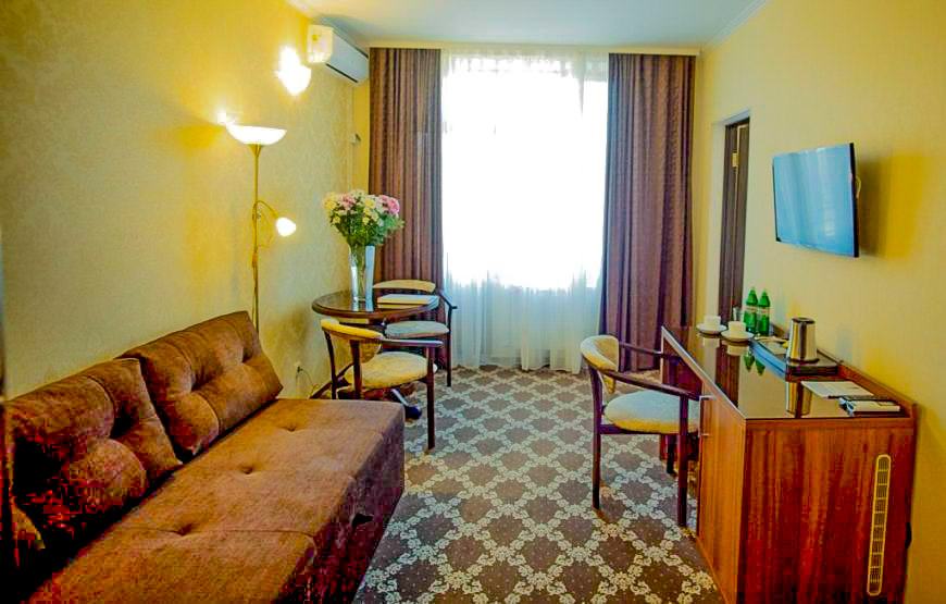 A cozy two-room suite with a bed (1.8 m by 2.0 m), a bathroom (shower, toilet, sink), bedside tables, an armchair, a desk, a sofa, a wardrobe, a round table, a floor lamp.