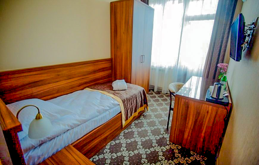 Cozy one-room room for 1 person with a bed (0.9 m by 2.0 m), bathroom (shower, toilet, sink), bedside table, armchair, desk, wardrobe.