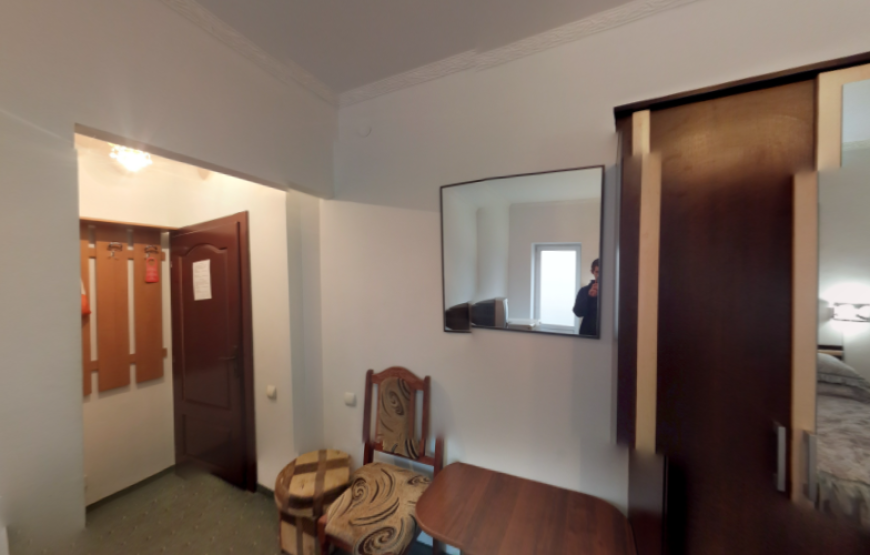 The room consists of a bedroom, a small hallway and a bathroom. The room has a bed, TV (satellite TV), wardrobe, bedside tables, refrigerator, iron, ironing board, electric kettle, dishes.