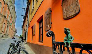 The sculpture of the last Transcarpathian opryshk (participant of the peasant insurgent movement) Mykola Shugai was installed by Mykhailo Kolodko on January 31, 2015 on the railing of one of the oldest coffee shops Uzhgorod “Under the castle”, address: 3 Ivan Olbrakhta Street (GPS: 48.620629, 22.303882).