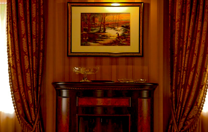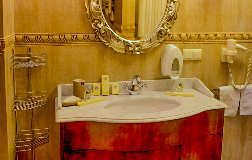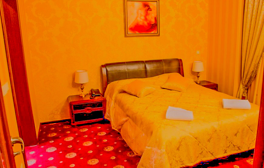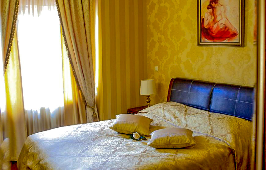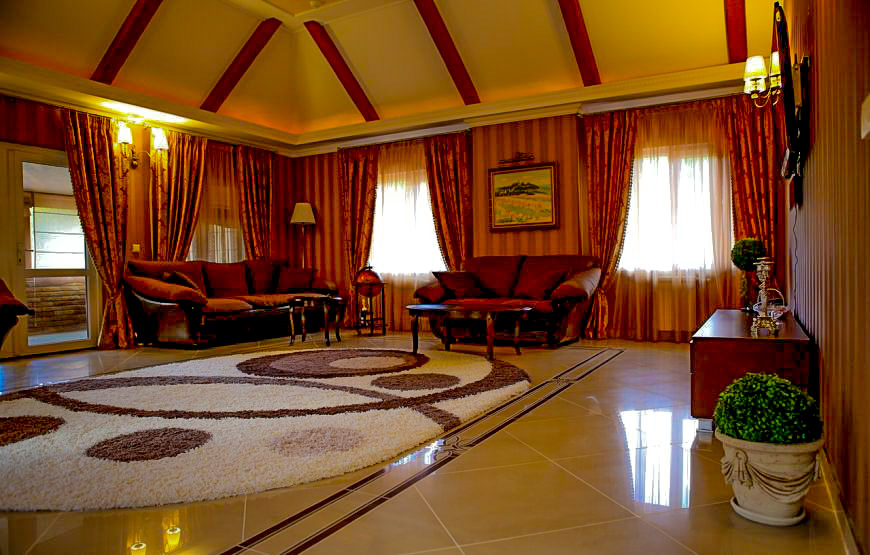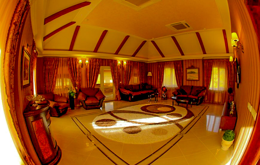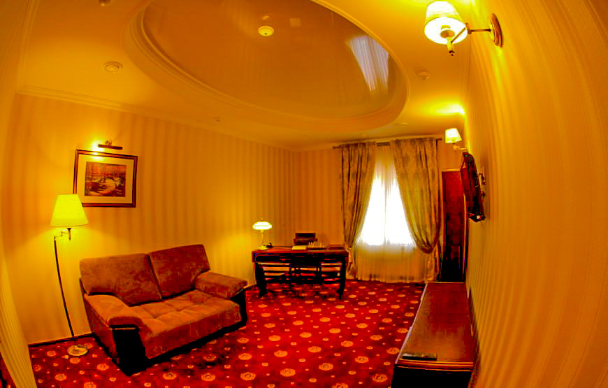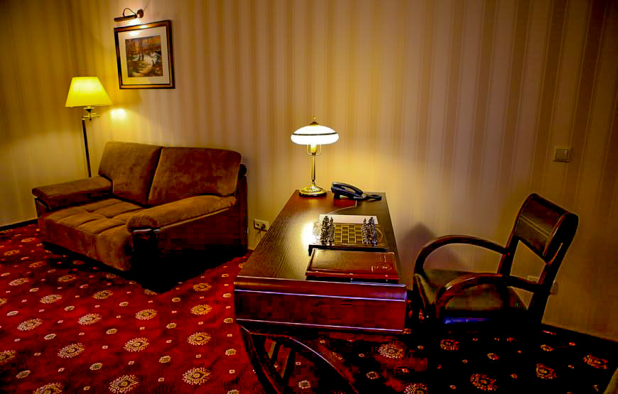 У номері 2 спальні кімнати, 2 суміщених санвузла (туалет, умивальник, душова, ванна, фен, банні халати, косметика) двоспальне ліжко в кожній кімнаті, м’яка частина, крісла, камін, робочий кабінет, шафа-купе, сейф, 2 телевізори (кабельне ТБ), кондиціонер, міні-бар, велика тераса з розсувними вікнами і плетеним меблевим гарнітуром.