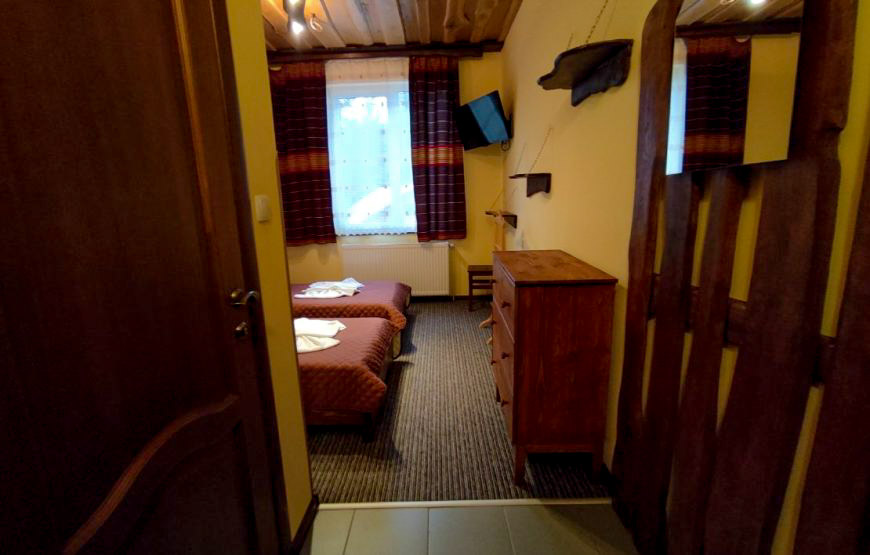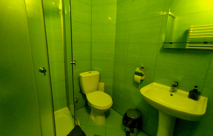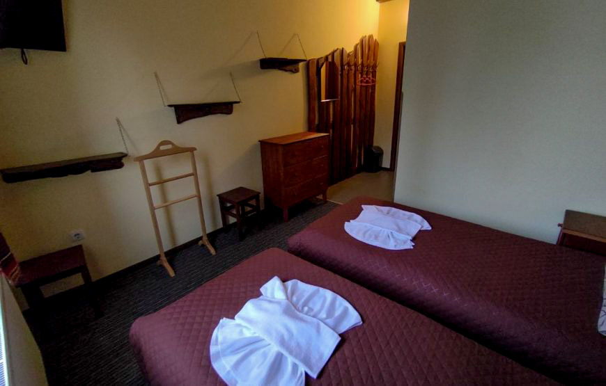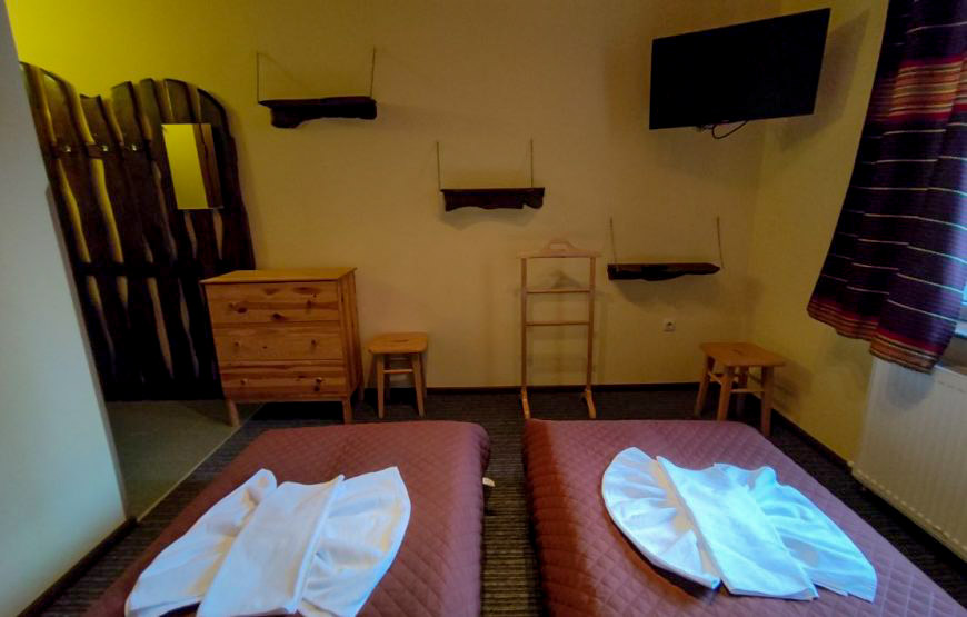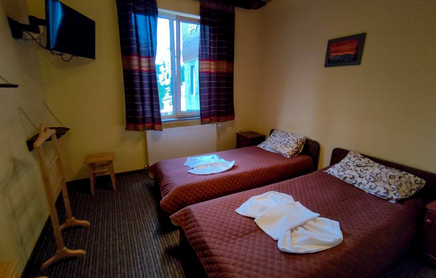Двомісний номер площею 16 м. кв. з двома окремими ліжками, власною ванною кімнатою і мінімально необхідною кількістю меблів. Також є 32′ телевізор.