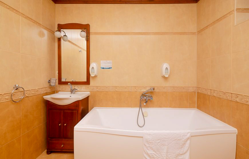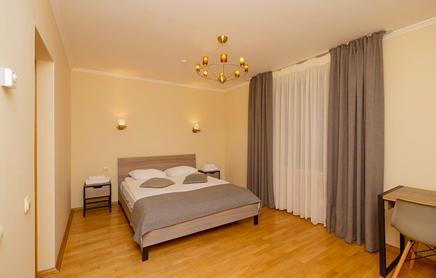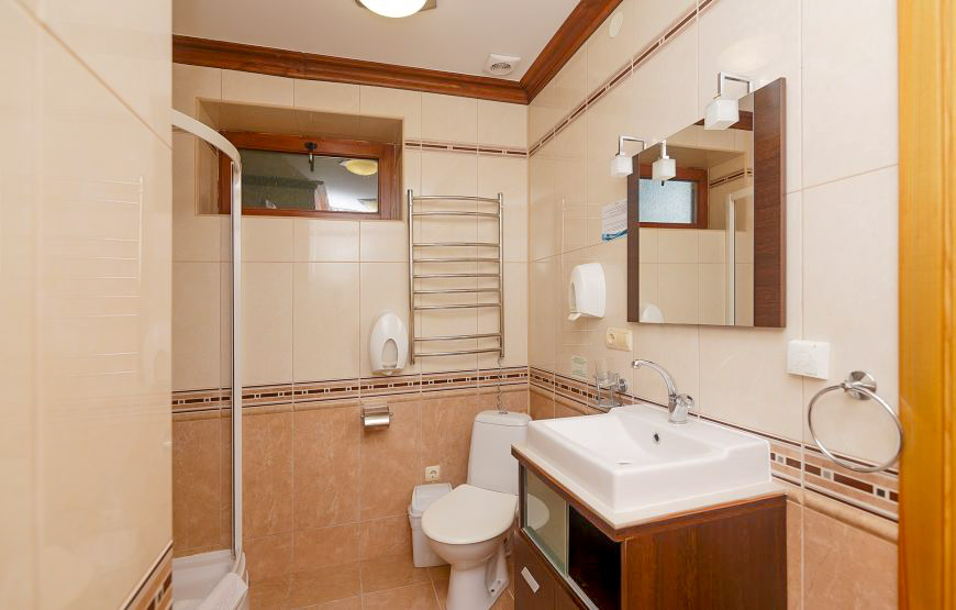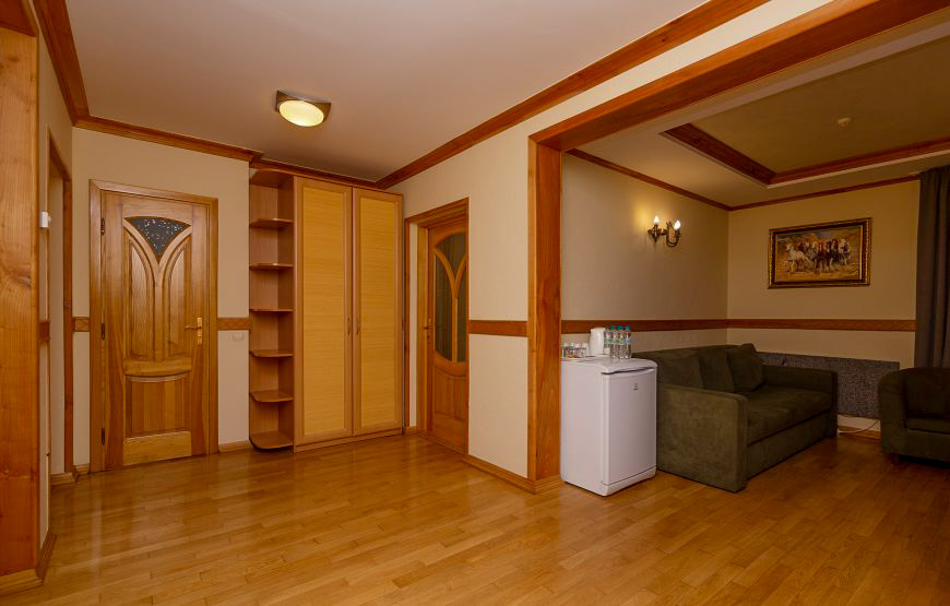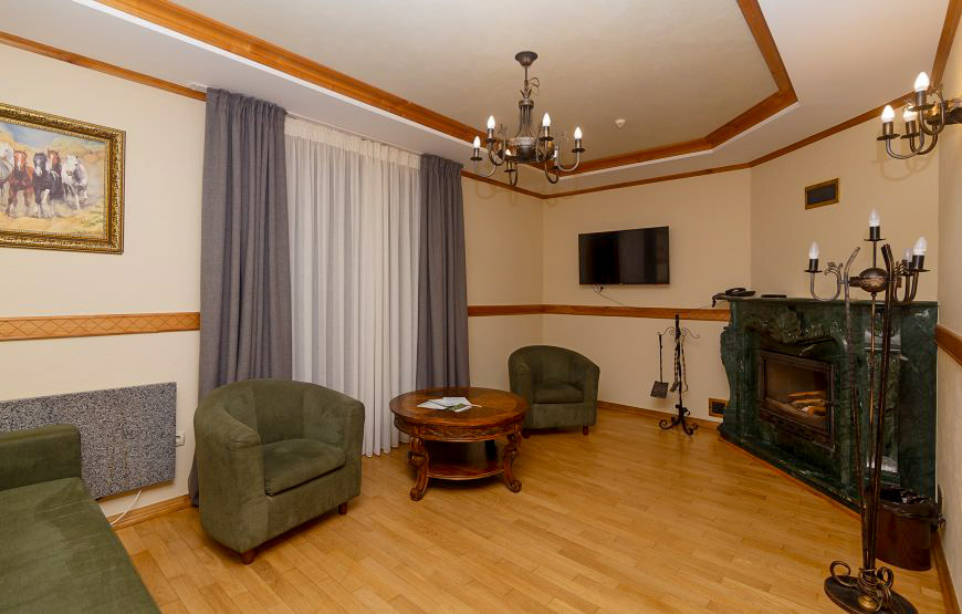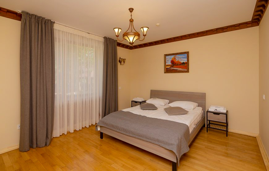 Просторий чотирикімнатний номер у дерев’яному коттеджі на першому поверсі. Котедж розташований відокремлено і чудово підходить для великої родини до 6 осіб.
