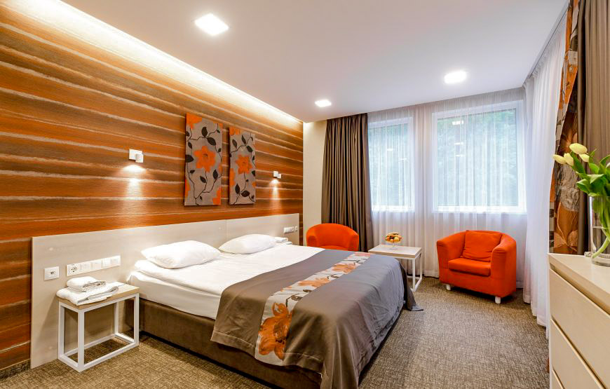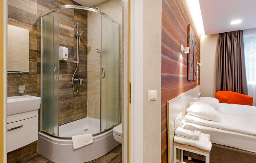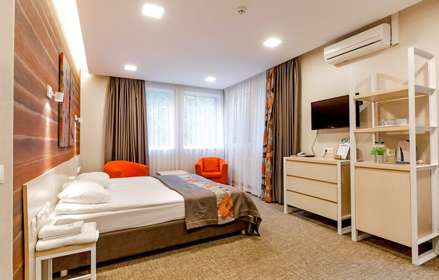 Удобный однокомнатный двухместный улучшенный номер “Комфорт” оформлен в современном стиле с широкой и удобной кроватью.