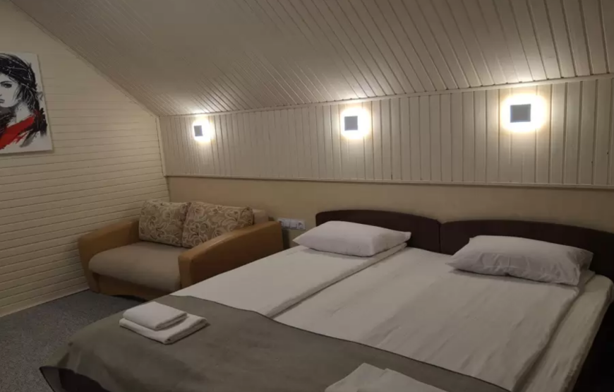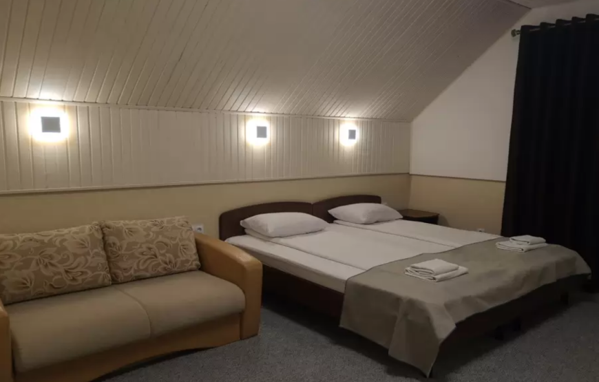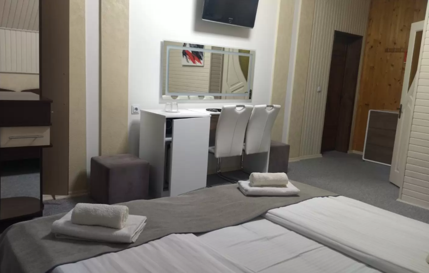 Комплектация номера: 1 двуспальная кровать, шкаф, кресло-кровать, набор минипарфюмерии, санузел, душ, умывальник, фен, телевизор, спутниковое ТВ, холодильник, Wi-Fi, сейф, отдельный вход, вид с номера на горы, ковры на полу.