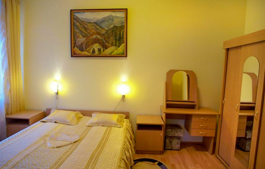 Номер “Люкс” состоит из двух комнат (спальни и гостиной), коридора и санузла. В спальне есть широкая двухместная кровать, две тумбочки, тоалетка с зеркалом, трехдверный шкаф, коврик. Над кроватью установлен бра. Интерьер комнаты украшают картины местных художников.