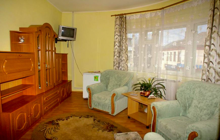 В гостиной все предусмотрено для вашего отдыха, приема гостей или проведения деловых встреч. При необходимости раздвижной диван обеспечит Вам дополнительно 1-2 места.