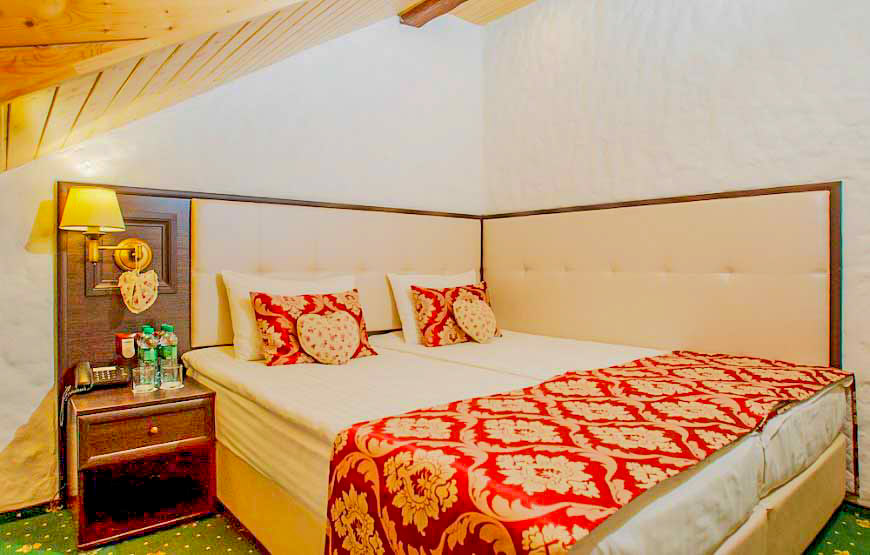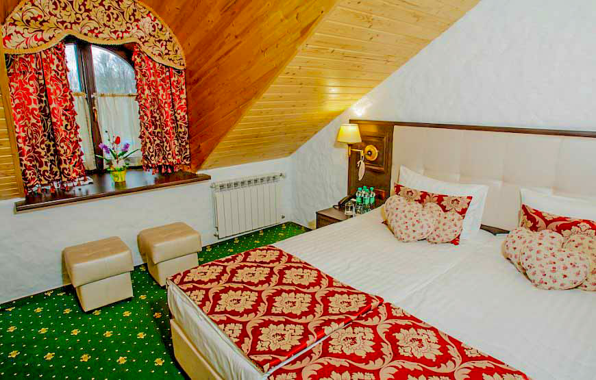 Интересный вид из окна, натуральная отделка номера, комфорт и атмосфера влюбленности – все это ждет Вас в номере “Мансарда Романтик”.