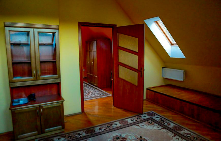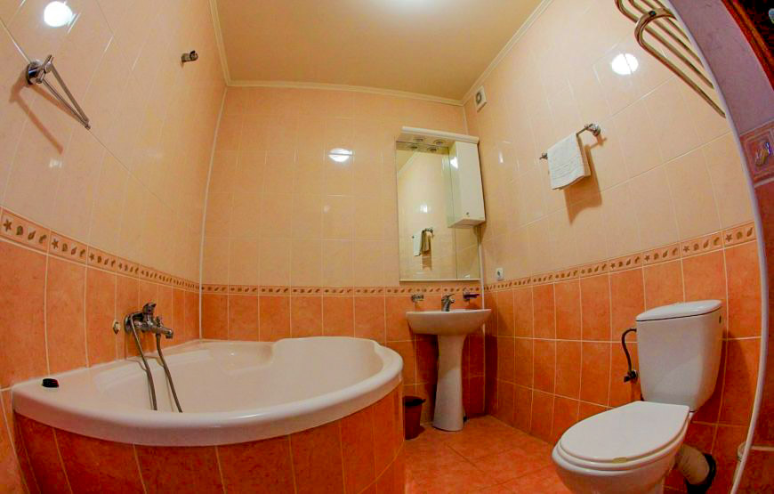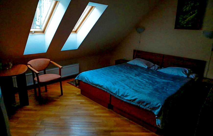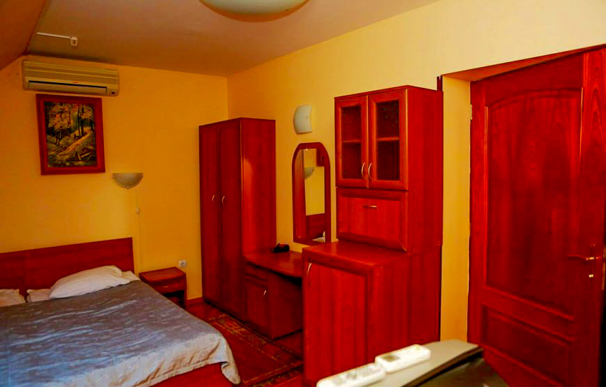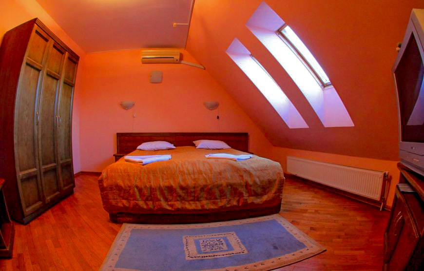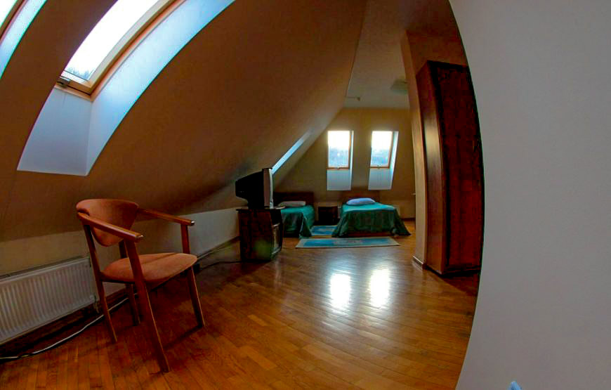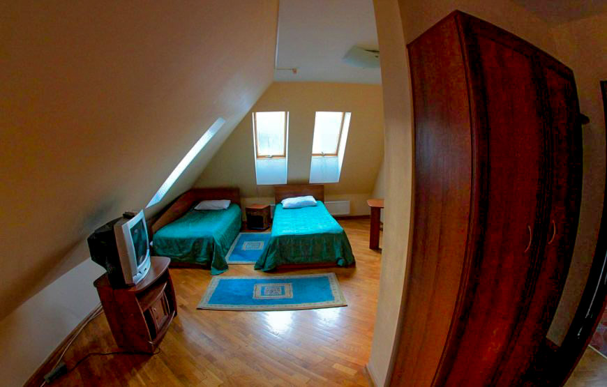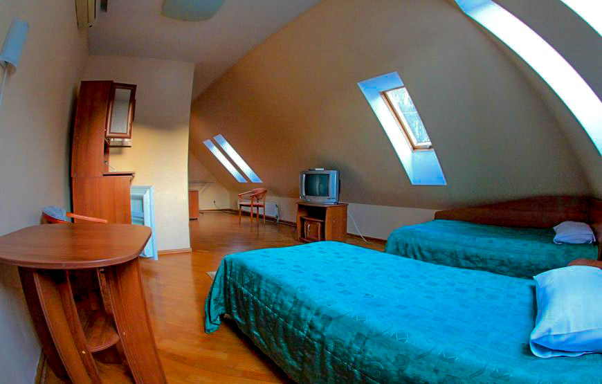 Полулюкс мансардного типа (13 номеров) — двуспальная или 2 односпальные кровати, шкаф для одежды, телевизор, холодильник, электрочайник, посуда, санузел (ванна, туалет, умывальник, фен).