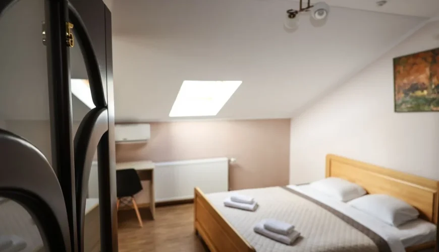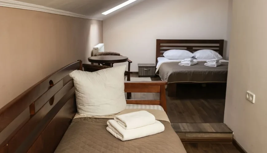 Трехместный номер Супериор в отеле «Лесная сказка», расположенном в селе Велятино, включает в себя одну двуспальную и одну односпальную кровать, холодильник, телевизор, чайник, душевую кабину, санузел, кондиционеры.