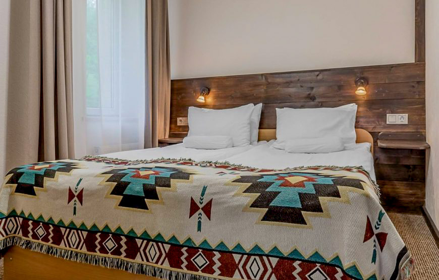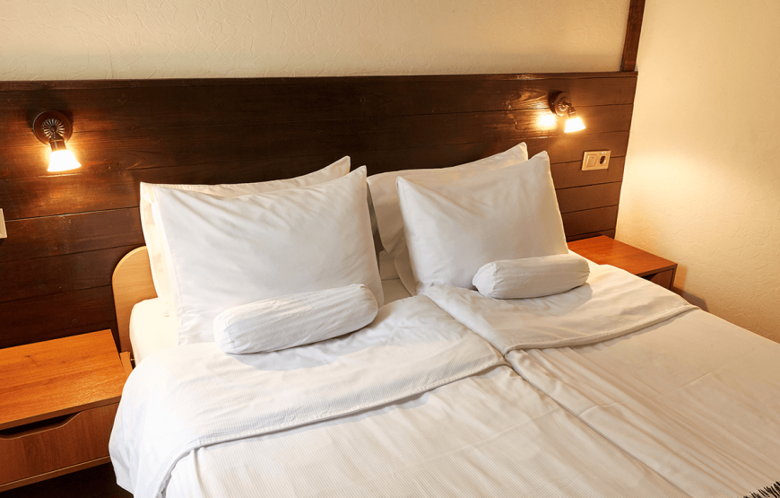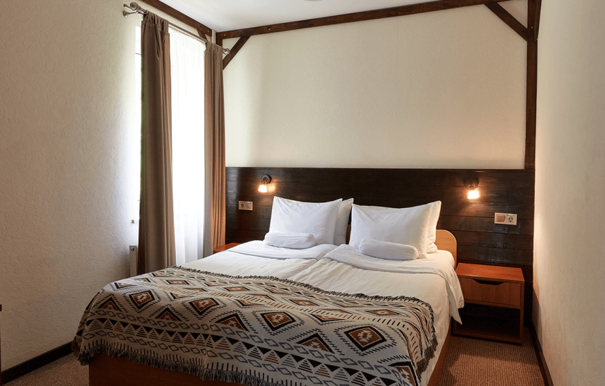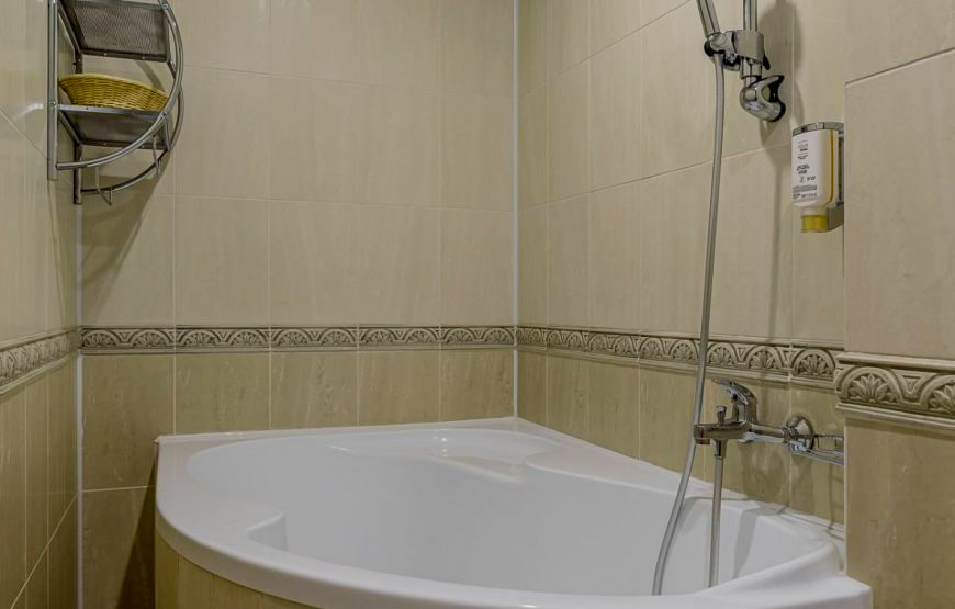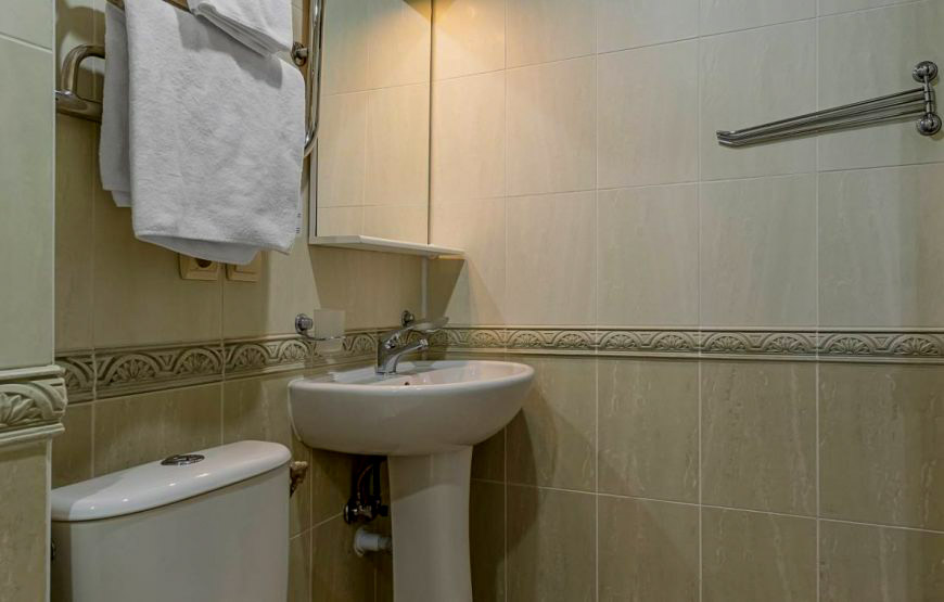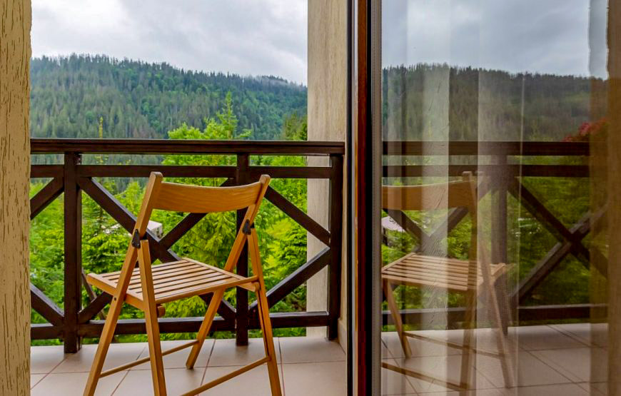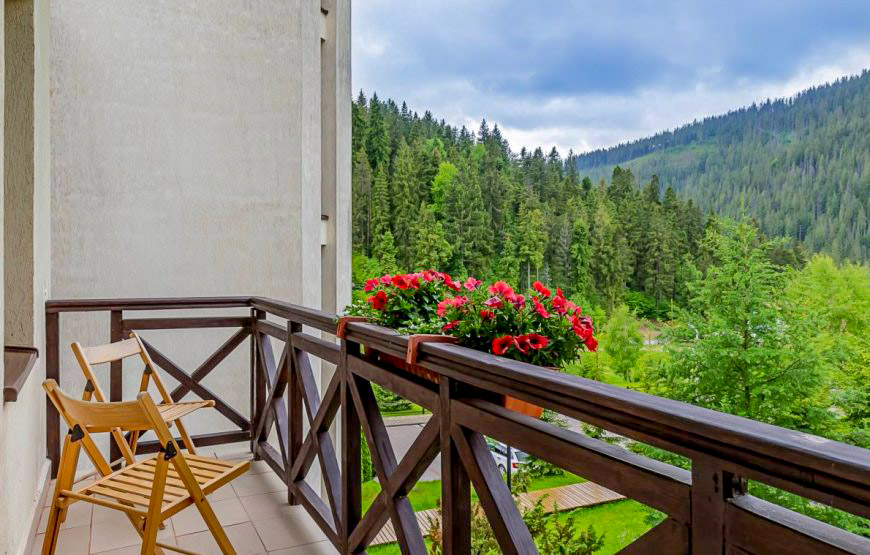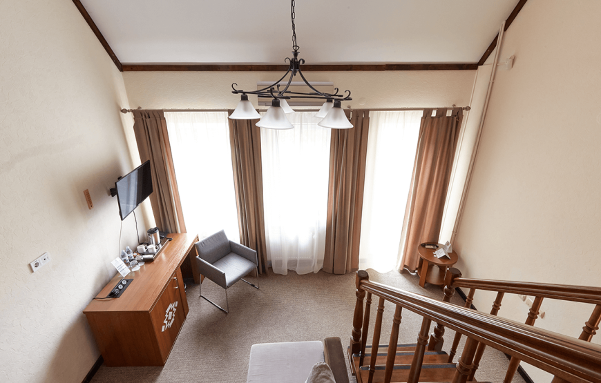 Просторный трехуровневый номер с балконом. На первом уровне находится коридор, туалет и гардеробная. На втором – гостиная, откуда лестница вверх ведет в спальню и ванную.