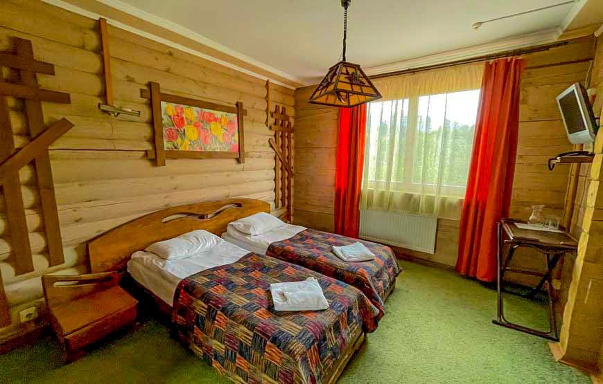 Удобный однокомнатный двухместный номер с односпальными кроватями. Идеальный вариант для путешествующих с друзьями или по делам с коллегами. Номер категории Стандарт находится на втором этаже гостиницы «Изки» и открывает сказочный пейзаж за окном.