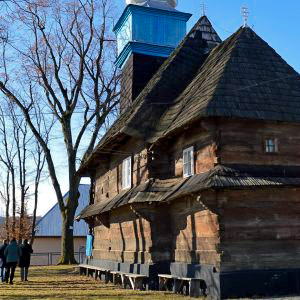 Равные срубы невы и притвора храма шире пятигранного сруба алтарной части. Подождество, опоясывающее сооружение, у западной стены храма образует крышу крыльца, стоящую на резных столбцах. Нава и бабинец имеют общую высокую крышу. Крыша алтарной части выглядит миниатюрной. Над притвором возвышается квадратная башня с шатровой крышей, которая переходит в высокий острый шпиль с четырехскатным фартуком, завершающимся крестом. Сейчас церковь покрыта серой шиферной черепицей этернитом, который был установлен вместо деревянного покрытия крыши еще в 1937 году. Несмотря на эту реконструкцию, храму удалось сохранить свой первоначальный вид почти неизменным.