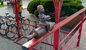 На площади Корятовича возле хорошо известного всем ужгородцам магазина "Кобзарь" есть еще одна необычная мини-скульптура Михаила Колодко, с которой можно